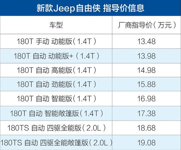 4月16日,广汽菲克Jeep新款自由侠正式上市,此次共推出8款车型,售价区间13.48-19.08万元。新车对配置方面进行了提升,依旧提供1.4T和2.0L两种动力选择。