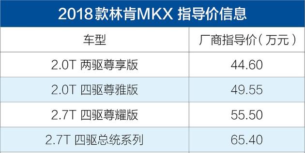日前,2018款林肯MKX正式上市,新车动力参数未做改变,搭载2.0T和2.7T两款发动机,共推出4款车型,其售价区间为44.6-65.4万元。