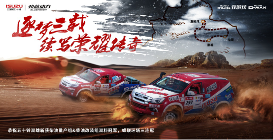 2016年,江西五十铃首秀环塔,便夺取量产组及厂商杯双料冠军,一鸣惊人。作为越野车领域的新星,2017年江西五十铃车队再次征战环塔,再度问鼎冠军头衔。坚守越野之路的江西五十铃不断提升自己,2018年三战环塔,用三连冠佳绩传递出“永不止步”的越野精神。