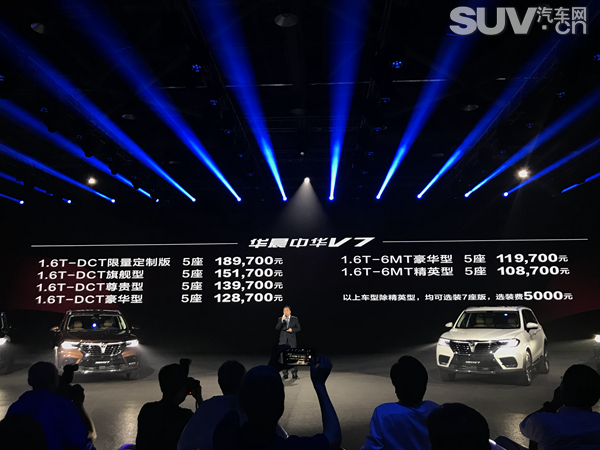 今晚(6月29日),华晨中华全新中型SUV——中华V7正式上市,新车作为华晨中华最新旗舰SUV车型,基于全新的M8X平台进行打造。据悉,中华V7将提供5座和7座两种座椅布局的共计11款车型。全系均搭载一台最大功率204马力的1.6T发动机,并分别匹配7速双离合变速箱及6速手动变速箱,该车售价区间为10.87-19.47万元,详见下表。