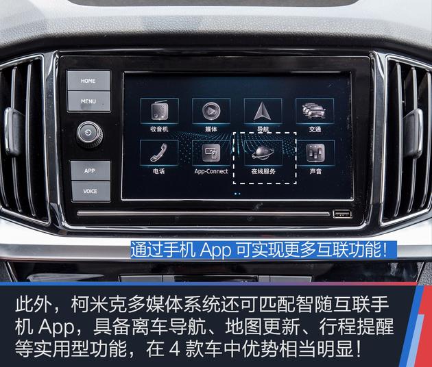 首先,斯柯达柯米克全系都搭载了8英寸屏,要比其它几款车型更具有诚意。此外,它采用了由科大讯飞定制开发的AI云助手和多项在线互联科技,在日常使用时科技感更强、实用意义也更加明显。在满足娱乐功能的同时,柯米克的多媒体系统在导航、语音控制方面的表现足够稳定且人性化,整体足够抢眼。