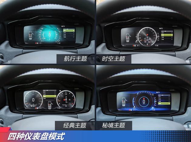 中控台偏向驾驶员一侧倾斜,基本操作都由中间屏幕完成,只有空调区域保留了实体按键,电子档杆和全新沃尔沃V60的也有些类似,10.25英寸的全液晶仪表不仅显示内容丰富,还有经典主题、时空主题、航行主题、秘境主题四种主题模式可以选装,有效降低了审美疲劳,又充满科技感。