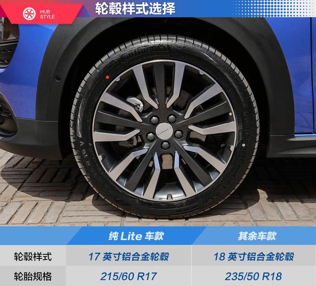 底盘悬架方面,领克02采用了前麦弗逊式独立悬架、后多连杆式独立悬架的组合,均带有横向稳定杆。除去纯Lite车款匹配的为215/60 R17的轮胎外,其余车款的轮胎尺寸均为235/50 R18。