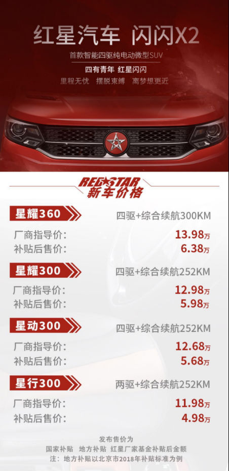 在新能源补贴及购置税优惠下,红星闪闪X2车型投放市场的开局,便已拥有价格方面的优势。其各个配置补贴前的市场指导价也在发布会上进行了公布,价格详情如下。